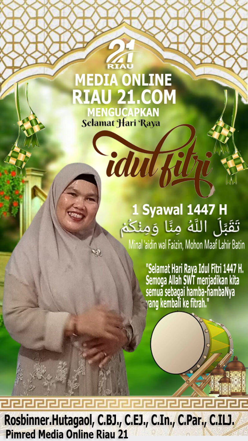 PEKANBARU | Pimpinan Redaksi Media Online Riau 21.com, Rosbinner Hutagaol, menyampaikan ucapan selamat Hari Raya Idul Fitri 1447 Hijriah kepada seluruh masyarakat, sekaligus mengajak untuk menjadikan momentum ini sebagai ajang memperkuat silaturahmi dan kembali kepada fitrah setelah menjalani ibadah puasa Ramadan.