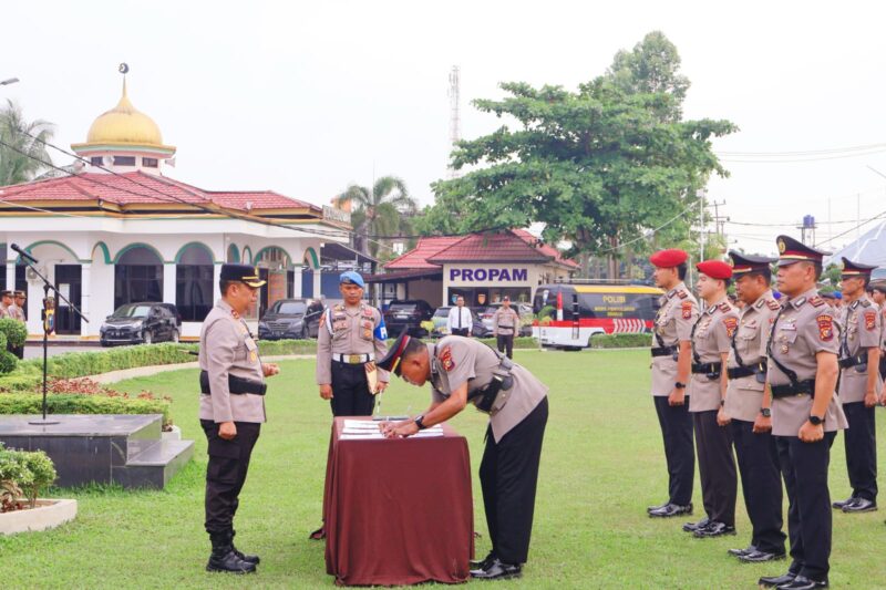 Kapolres Pelalawan, AKBP John Louis Letedara, S.I.K., memimpin upacara sertijab dan menekankan pentingnya menjaga soliditas internal serta meningkatkan sinergi dengan masyarakat dalam menjaga keamanan dan ketertiban di wilayah hukum Polres Pelalawan.